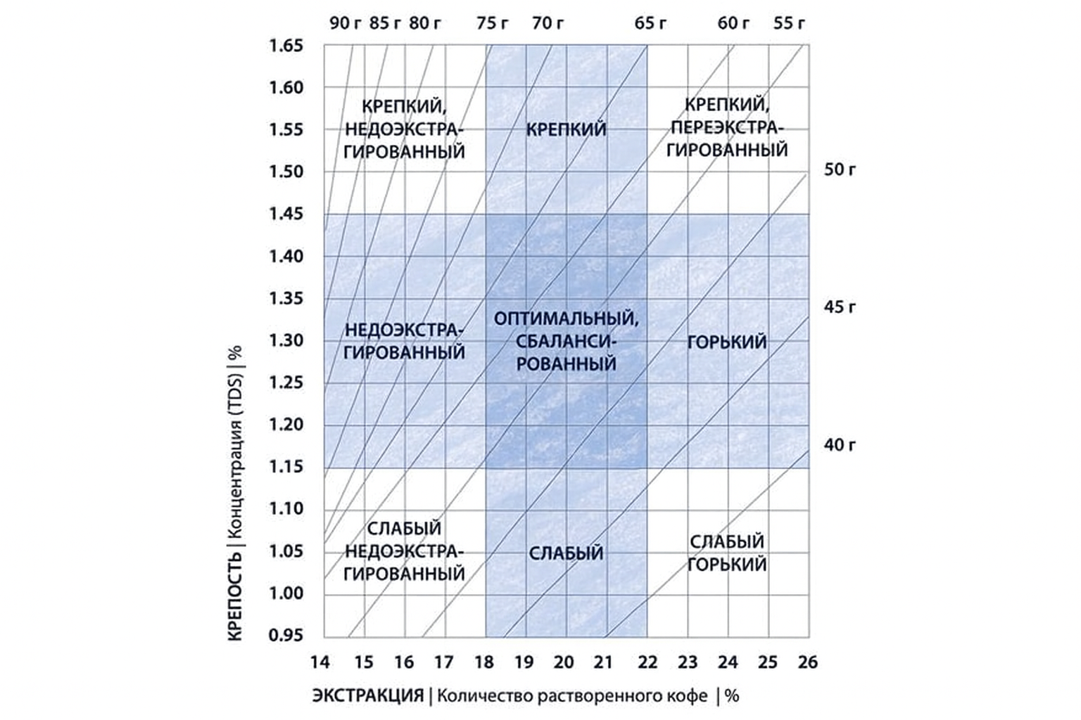 - Стандарт по SCA: 55 - 60 г кофе на 1 литр воды.